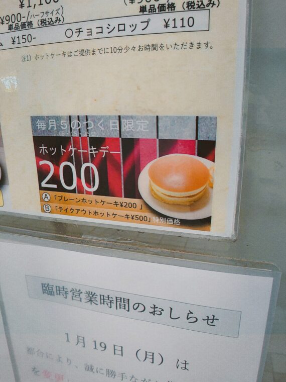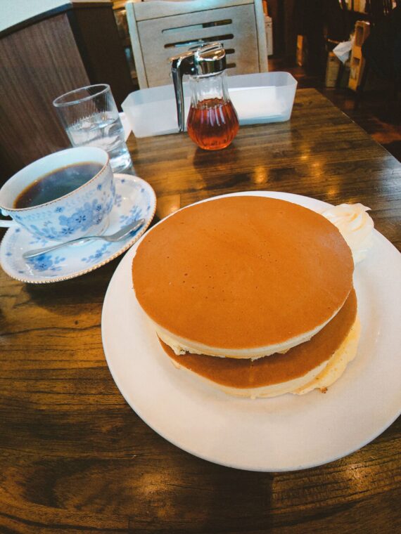 ちなみにホットケーキは、モーニング終了後の時間帯のみにはなりますが、毎月5のつく日に200円!と激安になるので、狙って行くのもアリですね。