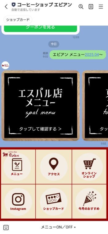 また、エビアンには公式LINEがありまして、登録するとLINEからメニューを確認できます。